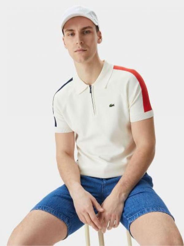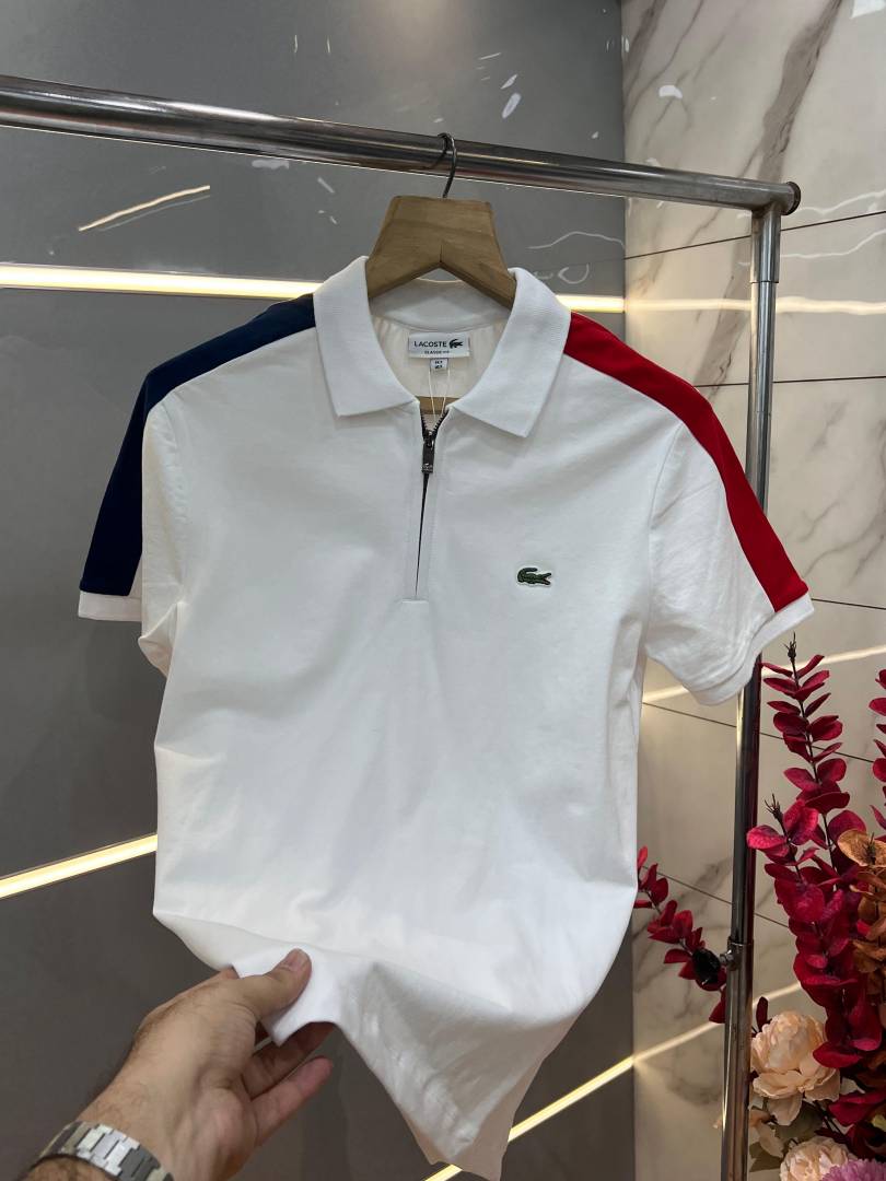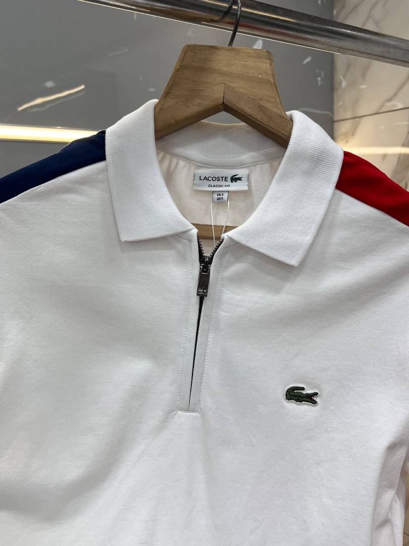Lacost e White Premium Cotton Lycra Pique fabric Polo Tshirt with Shoulder Design and Embroidered Logo Zip Style 3388